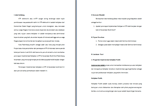 Contoh Makalah Tentang E-KTP (Implementasi Kebijakan E-KTP). Download File Format .doc atau .docx Microsoft Word. Isi makalah membahas tentang Teori Implementasi Kebijakan e-KTP di Kecamatan Bukit Kecil, Pengertian Implementasi kebijakan Publik, Proses Implementasi Kebijakan Publik, Formulasi Masalah Kebijakan Publik, Penjabaran Operasional Proses dan penerapan Implementasi Kebijakan, Kebijakan KTP elektronik atau e-KTP, Persiapan yang matang baik secara teknis dan non teknis dalam menjalankan kebijakan e-KTP, Mampu menSosialisasi kebijakan e-KTP di wilayahnya, Tingkat pendaftar e-KTP mencapai ± 97% dari warga yang terdaftar, Terpenuhinya tenggat waktu yang ditetapkan pemerintah dalam pembuatan e-KTP di kecamatan Bukit Kecil serta pembahasan lainnya.